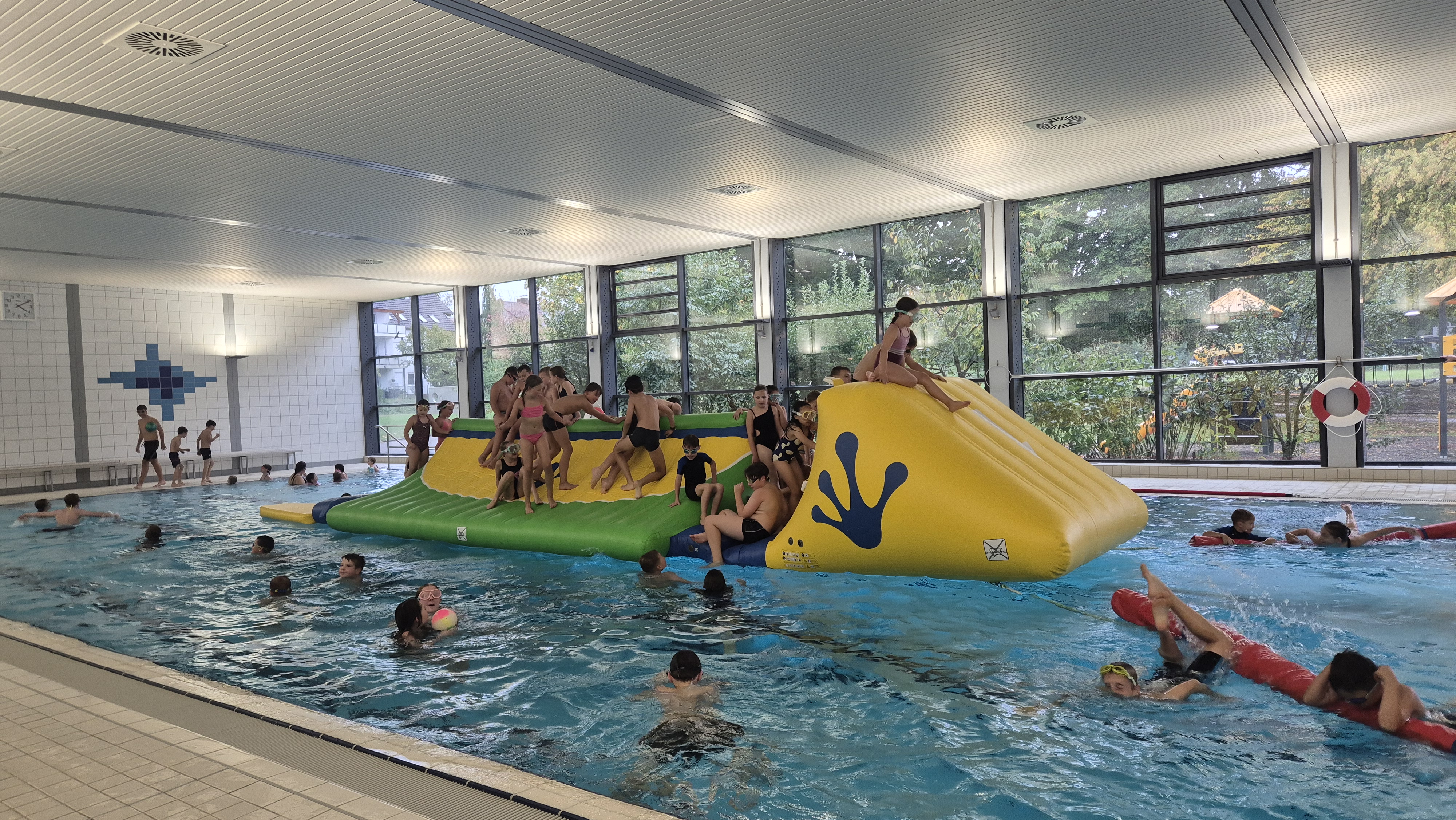 Unser neues Wasserspielgerät ist endlich da! Willst auch du es mal ausprobieren? Dann komm zu unseren Aktionen im Schwimmbad vorbei!